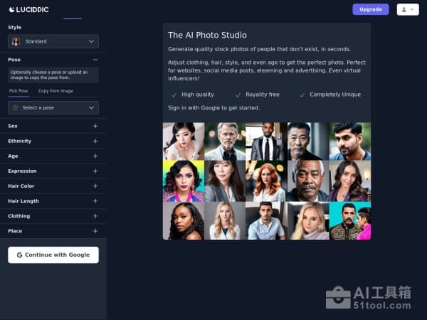 Lucidpic是一个快速生成不存在的人像的优质高清图库照片,允许用户调整服装、发型、风格,甚至年龄,以获得完美的人像照片。