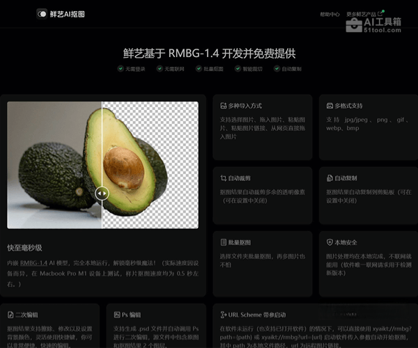 xyaikt://rmbg?path=C:Usersxy文件夹1.jpg(Windows示例)或xyaikt://rmbg?path=/Users/xy/Desktop/1.jpg(macOS示例)。- 对于在线图片,使用以下格式输入URL: