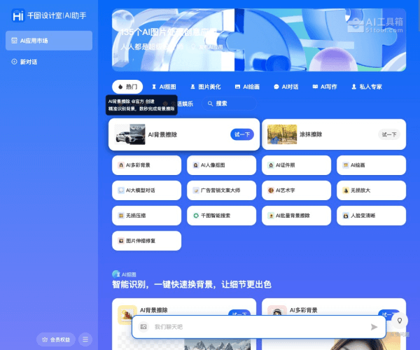 千图设计室丨AI设计助手是由千图推出的一个在线设计神器,内置135个AI图片处理创意应用,包括AI抠图、图片美化、AI绘画、AI对话、AI写作等,专为设计师和营销从业者量身打造。该工具箱不仅功能全面,而且集成了强大的AI技术,旨在提升你的设计效率,让创意流转不息。无论你是需要快速抠图,还是寻求创意灵感,千图设计室都能为你提供强有力的支持。