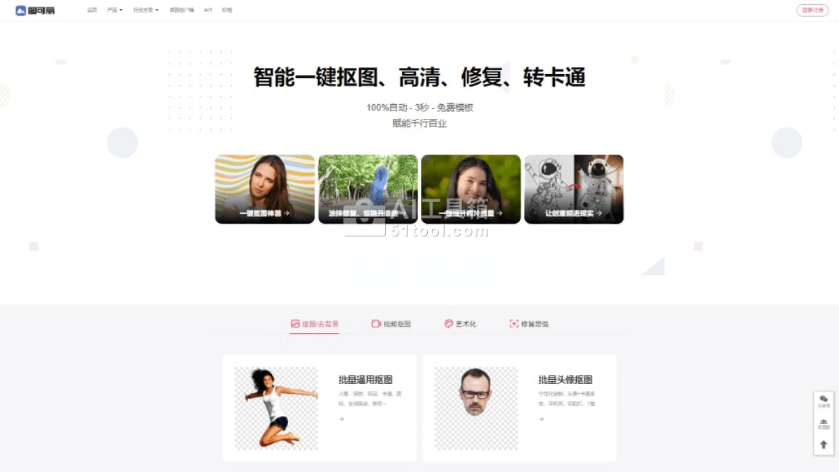 - 一键抠图:图可丽的核心技术之一是一键抠图功能,可以轻松移除图片背景,适用于简单的物品到复杂的人物肖像。