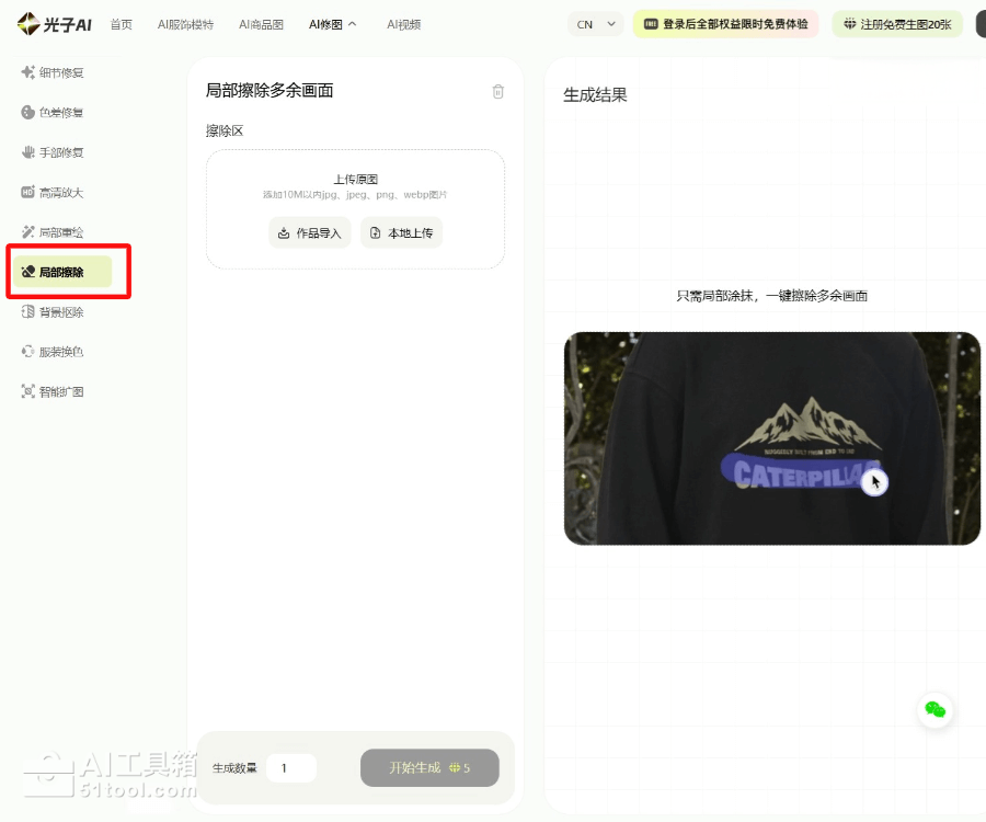光子AI消除是光子AI推出的AI修图局部擦除工具,主要用于智能去除图片中的多余元素。用户只需在需要擦除的区域进行涂抹,光子AI消除可自动识别并去除该区域的多余元素,操作简单快捷。光子AI消除广泛应用于商品图片优化和创意设计调整,能快速去除电商商品图片中的线头、瑕疵等,提升图片质量,在创意设计中方便用户对图片进行二次创意。通过智能算法精准去除多余元素,保持图片整体质量和细节,使图片更加专业和吸引人。