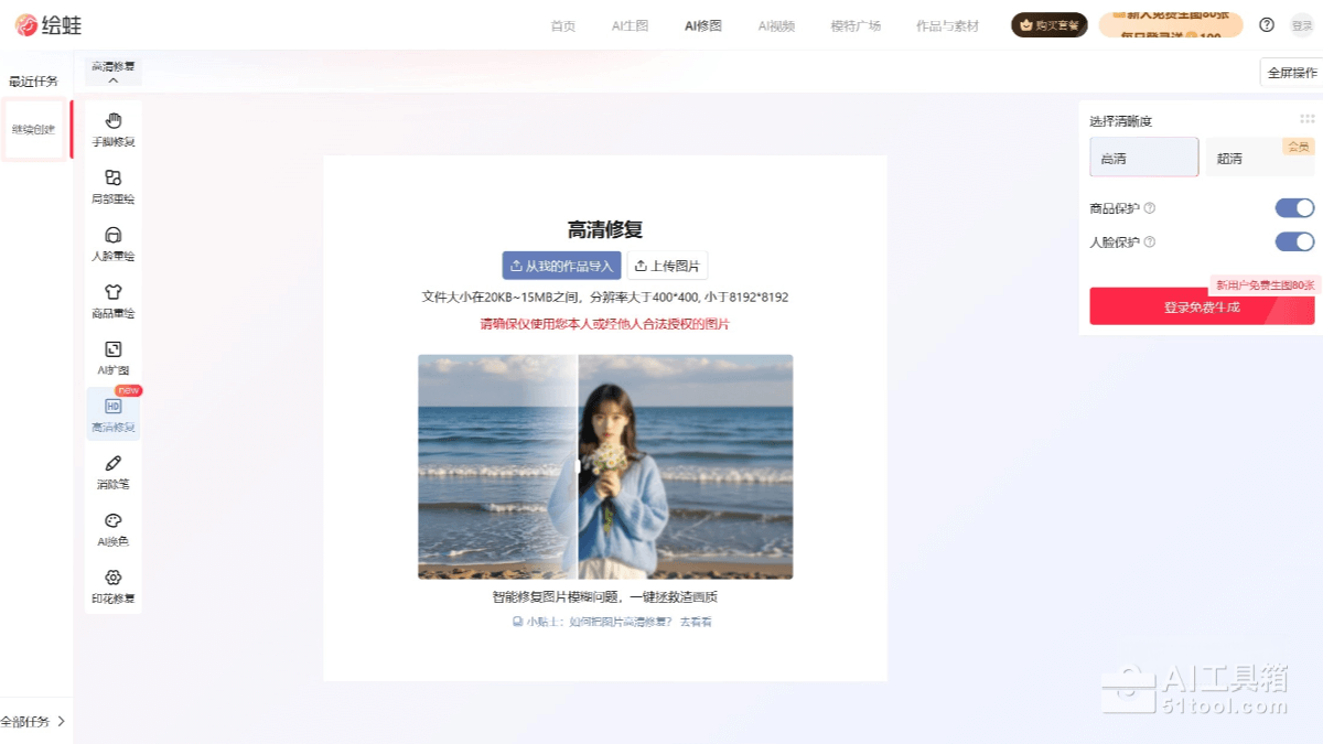智能提升分辨率:基于深度学习算法,对低分辨率图片进行智能放大和细节重建,有效提升图片的清晰度和质感,使模糊图片变得更加锐利、真实。
