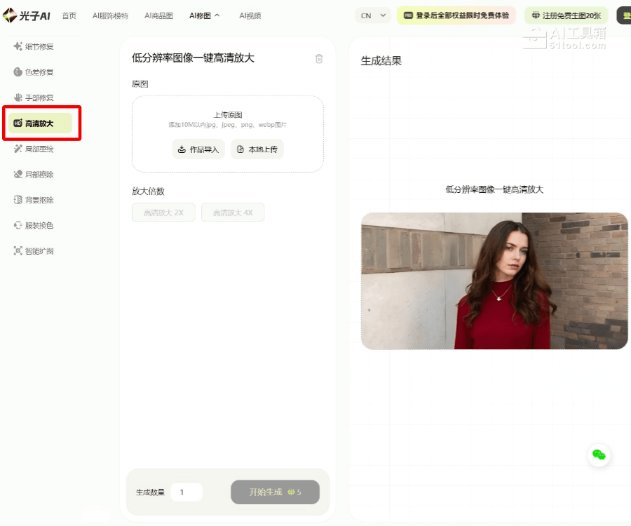 光子AI高清是光子AI推出的图像高清放大工具,能显著提升图片的分辨率,使模糊的照片或低清图像变得清晰,细节更加丰富。用户只需上传图片,选择清晰度模式,可快速完成操作。光子AI高清放大功能特别适合于老照片翻新、电商商品图修复以及低分辨率网络图片的增强等场景。