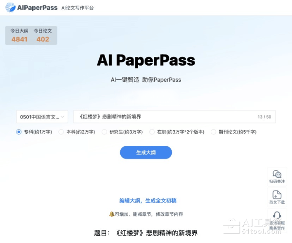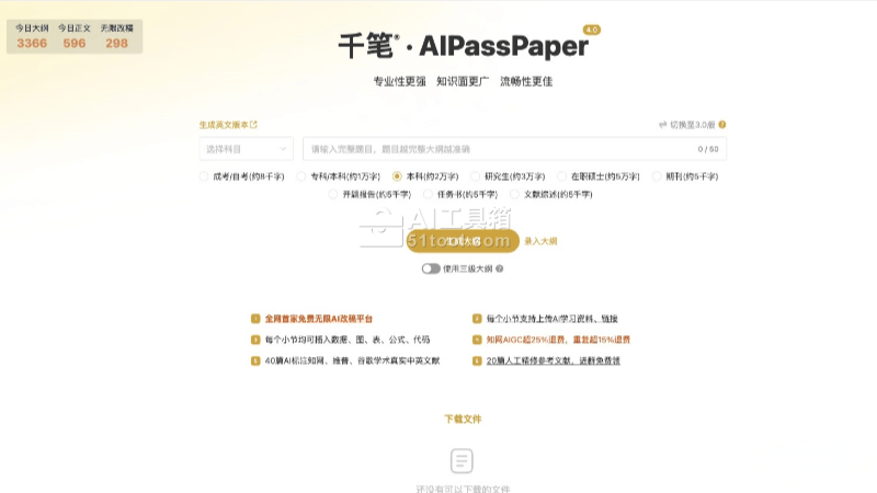 千笔AI论文(原AIPaperPass)是全网首家免费改稿AI论文写作平台,5分钟可产出5万字,提供真实网络数据、图、表、公式、代码,不限次2000字3级大纲,附带PPT、开题报告、任务书、40篇真实参考文献。知网AIGC率超25%退费,重复率超15%退费。千笔AI论文融合了先进的AI技术与丰富的学术资源,为用户提供了全面的论文写作支持,包括但不限于论文写作辅助、研究建议与指导、文献综述生成和论文修订与优化。