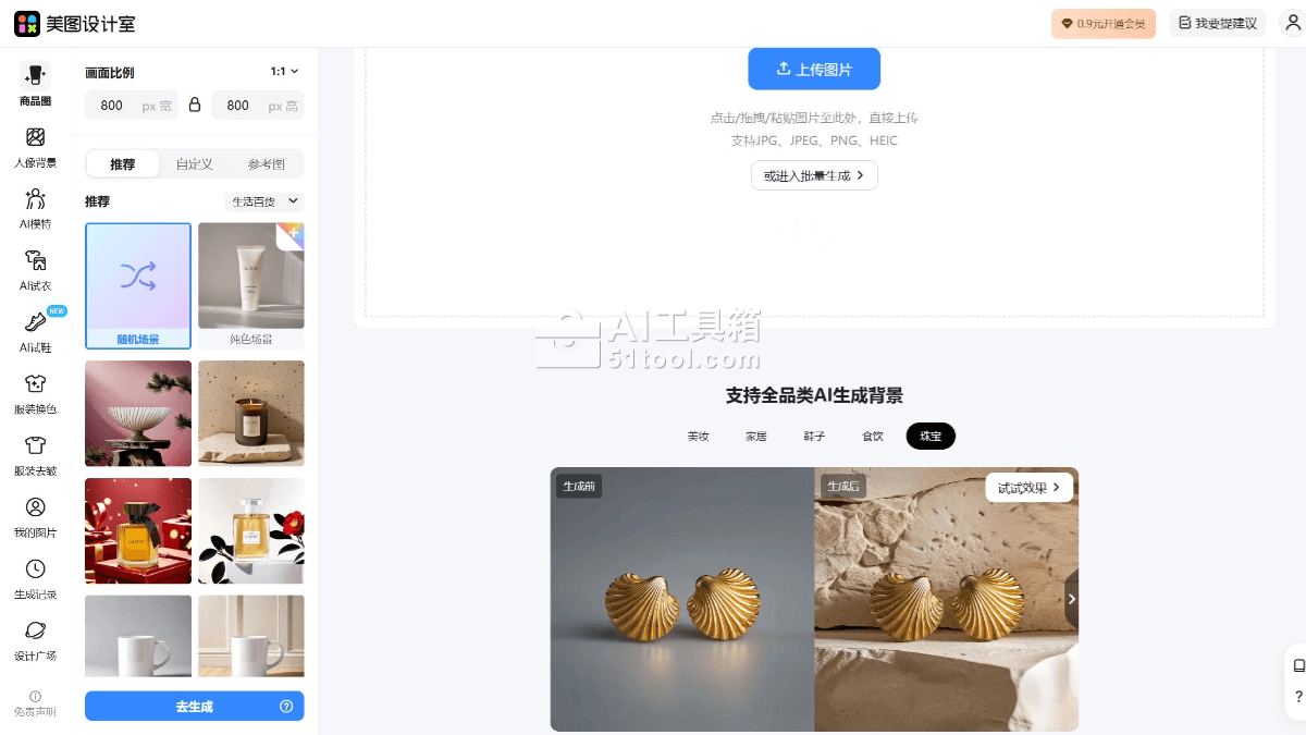 - AI商品图:用户上传产品图片后,AI自动抠出产品主体,支持多种产品品类识别,提供百余种推荐场景,生成多种风格的场景图,还原真实使用场景。