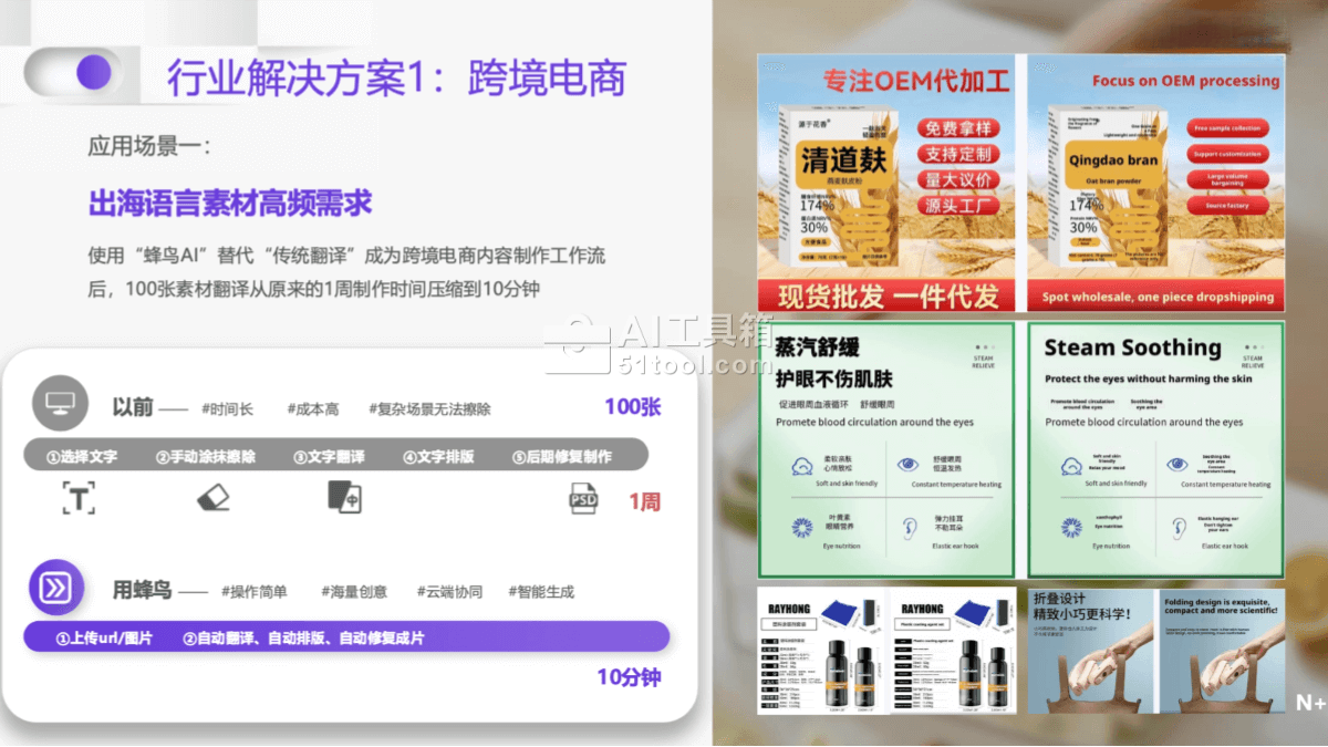 • 跨境电商推广:翻译图片文字,优化图片排版,生成多语言产品文案,提升产品吸引力。
