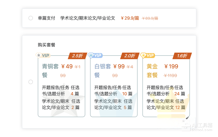 - 白银套餐:99元,提供开题报告/任务书/选题分析等任选10篇,学术论文/期末论文/毕业论文任选生成5篇