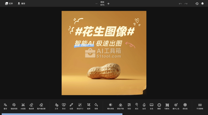 • 图片编辑器:花生图像提供了一系列图片编辑工具,包括调整亮度、对比度、饱和度等色彩参数,以及裁剪、旋转等基本操作。用户还可以应用各种滤镜和特效,如模糊、锐化、色彩叠加等,以增强图片的视觉效果。编辑器的操作界面直观易用,即使是初学者也能快速上手,制作出专业级别的图片。