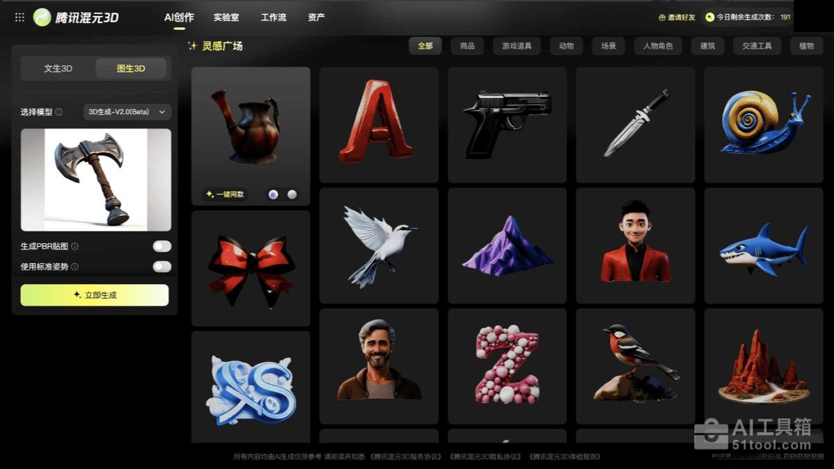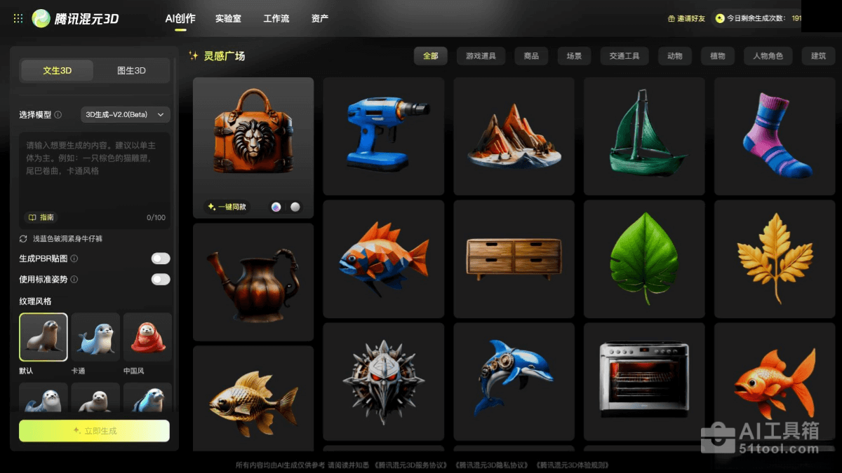 - 灵感广场:3D 模型素材库,提供丰富多样的 3D 模型素材,涵盖游戏道具、人物角色、商品、动植物等热门类别。用户根据不同场景类目查看对应的 3D 模型素材,并基于素材创作同款模型。
