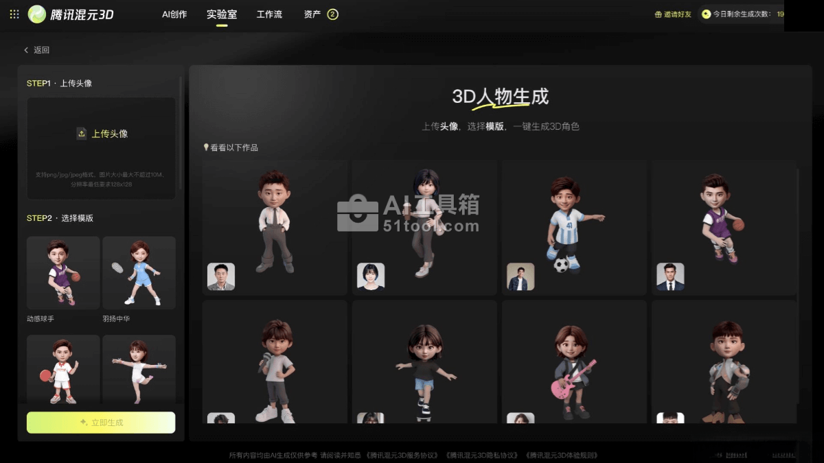 - 3D人物生成:支持用户根据自己的形象上传照片,选择不同的3D角色形象模板,生成个性化的3D人物角色模型,满足用户在虚拟形象创建、角色定制等方面的需求。