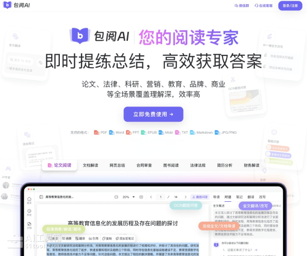 - 教育和学习:教师和学生可以利用包阅AI来辅助教材的阅读和学习,快速提取教学要点和学习重点。
