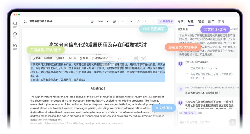 - 多格式文件翻译:支持全文翻译,帮助用户理解不同语言的文档内容。一键翻译功能,简化了跨语言沟通和文档理解的过程。