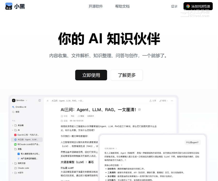 OmniBox 小黑是一款 AI 知识管理工具,帮助你高效地收集、整理与输出各种信息。 它能够处理多种信息来源(如网页、文件、文字与语音),为你打造从信息获取到内容创作的一体化工作流。