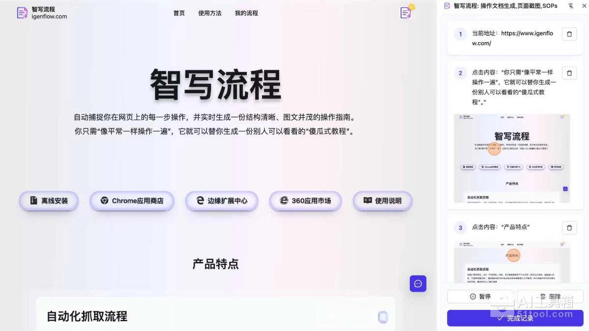 自动化捕获操作流程:安装扩展程序后,点击“开始录制”,智写流程智能跟踪鼠标点击、键盘输入、页面跳转等交互行为,实时生成带截图和文字说明的操作指南,降低人工编写成本约80%。
