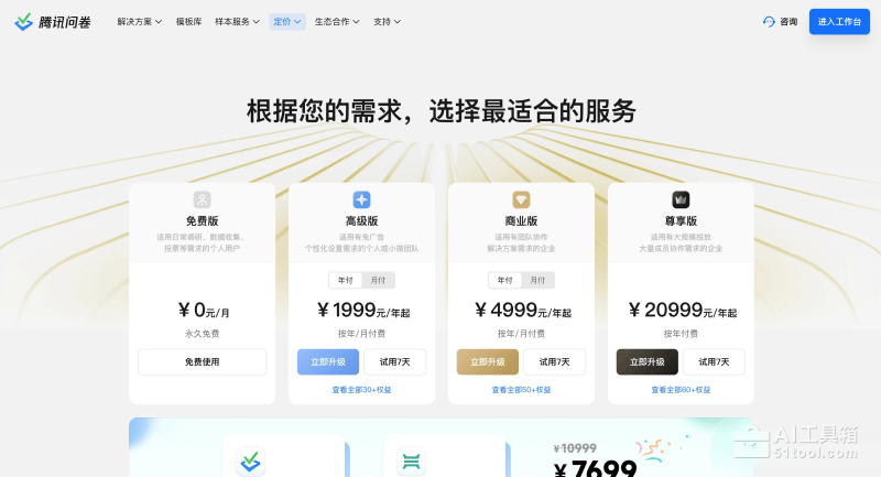 - 尊享版:20999元1年,提供免广告180万次、40位管理员、12次录入服务、多场景应用、分级查看统计、问卷审批、不限共享项目、团队模版、团队皮肤、全部接口服务、高并发保障、所有商业版功能等60项权益