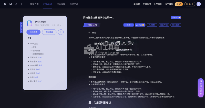 - 产品需求文档生成:输入产品名、原型图、功能名,一键生成PRD文档,支持PRD文档检查