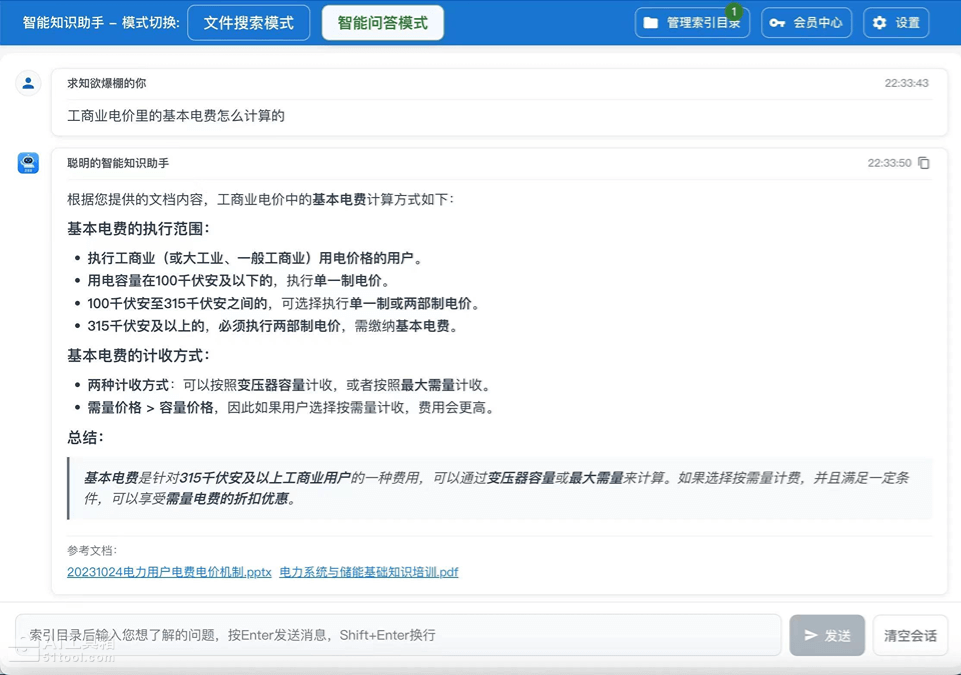 - 智能问答模式:直接用自然语言提问,AI基于文档内容回答并标注来源。