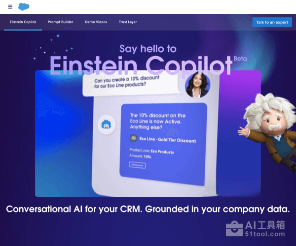 Einstein Copilot是由Salesforce公司推出的一款对话式人工智能助手,专为客户关系管理(CRM)系统设计。该AI助手的核心特点是能够利用公司独特的数据和元数据来提供可信赖的响应,可以根据公司内部专有的特定信息来理解和处理业务和客户关系。Einstein Copilot旨在通过提供更智能、更个性化的交互方式,帮助企业在 CRM 系统中更有效地使用 AI,提高工作效率,改善客户体验,并推动业务增长。
