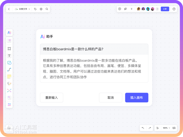 博思白板是集AI创作、一键AI生成PPT等多功能于一体的在线协作白板工具,支持实时编辑、绘图、头脑风暴等功能。用户可以在白板上自由添加文字、图片、图形等元素,实现团队协作和创意分享。适用于教育、商务会议、远程工作等多种场景,有效提升沟通与工作效率。
