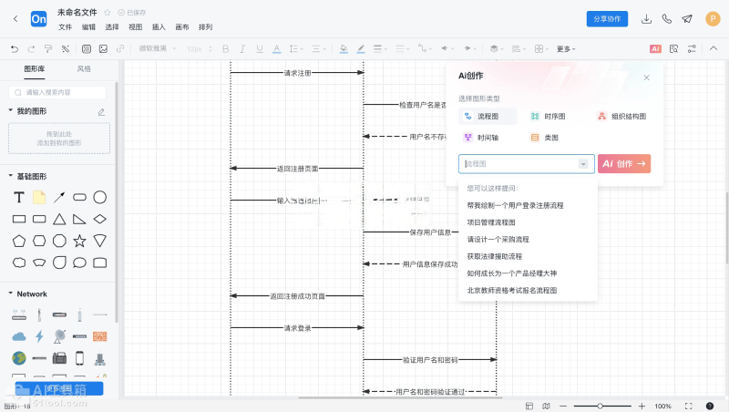 - 一键创作更多图形:输入主题,选择你想要生成的图形类型,时序图、组织结构图、类图统统不在话下,一键AI进行图形内容绘制。