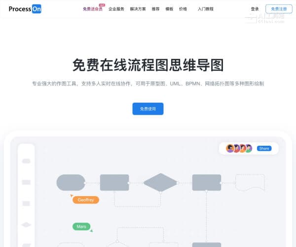 - 访问ProcessOn的官网(processon.com),点击【免费使用】