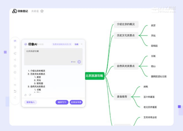 作为深受印象笔记用户喜爱的产品之一,「印象图记」在「印象AI」能力的加持下,现已具备了自动生成思维导图的能力,帮助用户理清思路、拓展思维。用户每天可免费使用 20 次 印象AI 体验生成思维导图和大纲笔记。