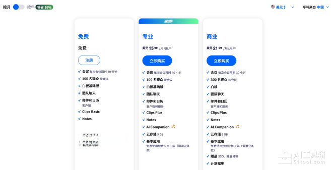 - 专业版:15.99美元/月/用户(159.9美元/年/用户),每次会议限时30小时、每次会议100名观众、基础版白板、团队聊天、邮件和日历、Plus版Clips会议录制、会议记录、AI Companion助手、5GB云存储、基本应用