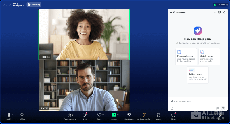 - AI助手:内置的AI助手(Zoom AI Companion)可以总结会议内容、协助头脑风暴、自动撰写和回复邮件,以及提供电话会议的摘要和任务提取。