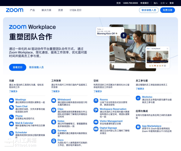 Zoom Workplace是视频会议公司Zoom推出的一个集成式的AI驱动的办公协作平台,旨在通过简化沟通和协作流程,提升团队生产力和员工参与度。该平台结合了Zoom的核心通信功能,如视频会议、聊天和电话服务,以及员工参与、空间管理和生产力工具。此外,还内置了Zoom AI Companion助手,能够总结会议内容、协助创意发想和快速撰写信息。Zoom Workplace致力于通过其全面的协作解决方案,帮助企业适应灵活工作的新常态。