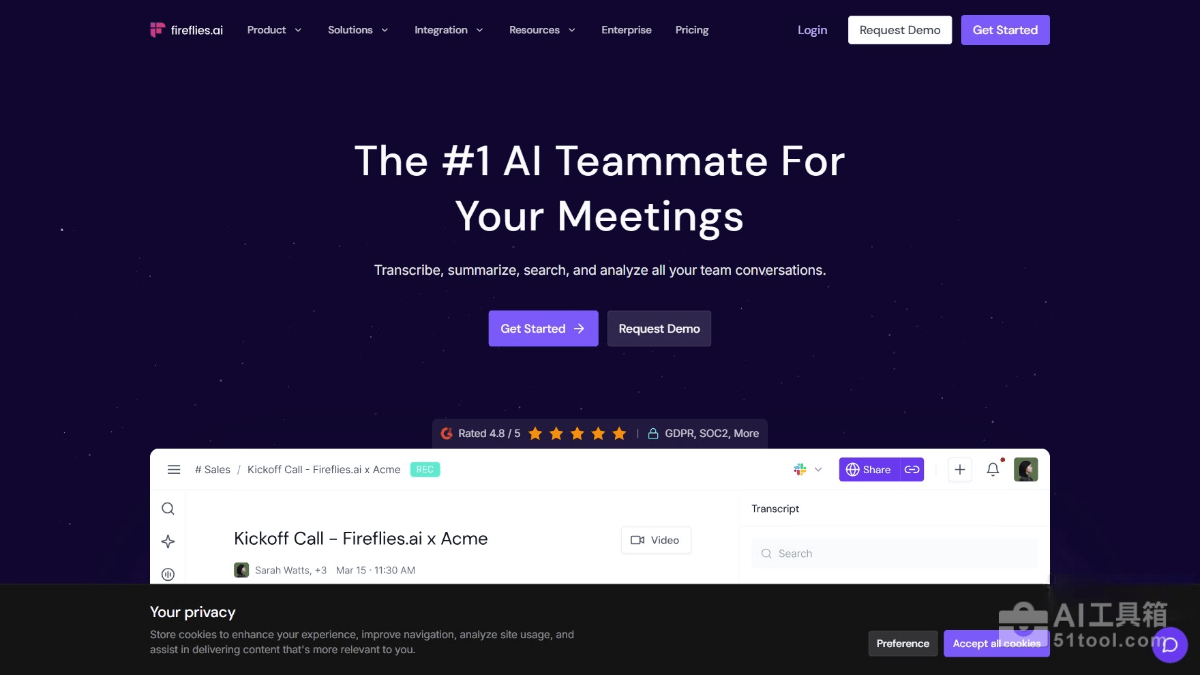 Fireflies.ai 是 AI 会议助手,能为用户提供高质量的会议转录、总结和分析服务。工具支持 100 多种语言,转录准确率高达 95%,具备自动识别发言人、自动语言检测等功能。用户能通过 AI Teammate Bot、Chrome 扩展、移动应用等多种方式记录会议,支持生成详细的 AI 总结、提取关键信息、生成后续邮件等。Fireflies.ai支持与多种工作工具集成,如 CRM、项目管理和 ATS 系统,助力企业提升会议效率和团队协作能力。