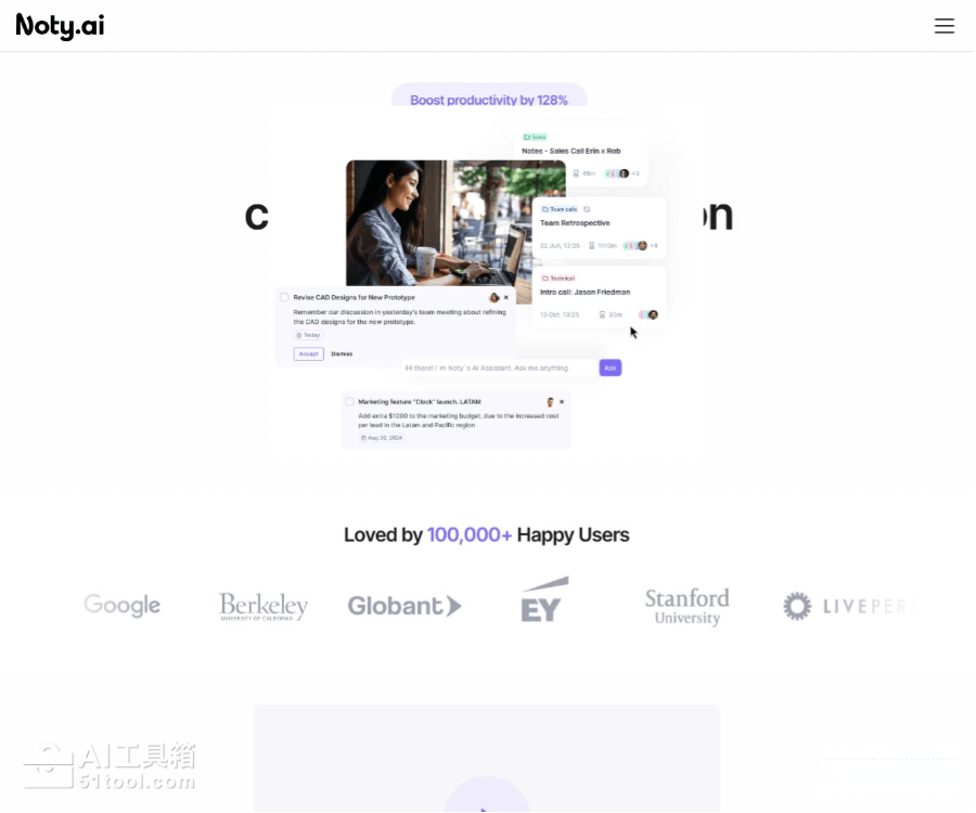 Noty.ai 是基于AI技术的提升会议效率工具。工具通过自动转录会议内容,捕捉关键细节和截止日期,帮助用户将会议转化为生产力的源泉。Noty.ai 能根据会议内容生成待办事项列表,让用户轻松优先处理任务,快速组织工作,让用户专注于行动项而非繁琐的行政任务。Noty.ai能与用户常用的工具集成,进一步提升工作效率,帮助用户高效利用会议时间,实现高效工作。