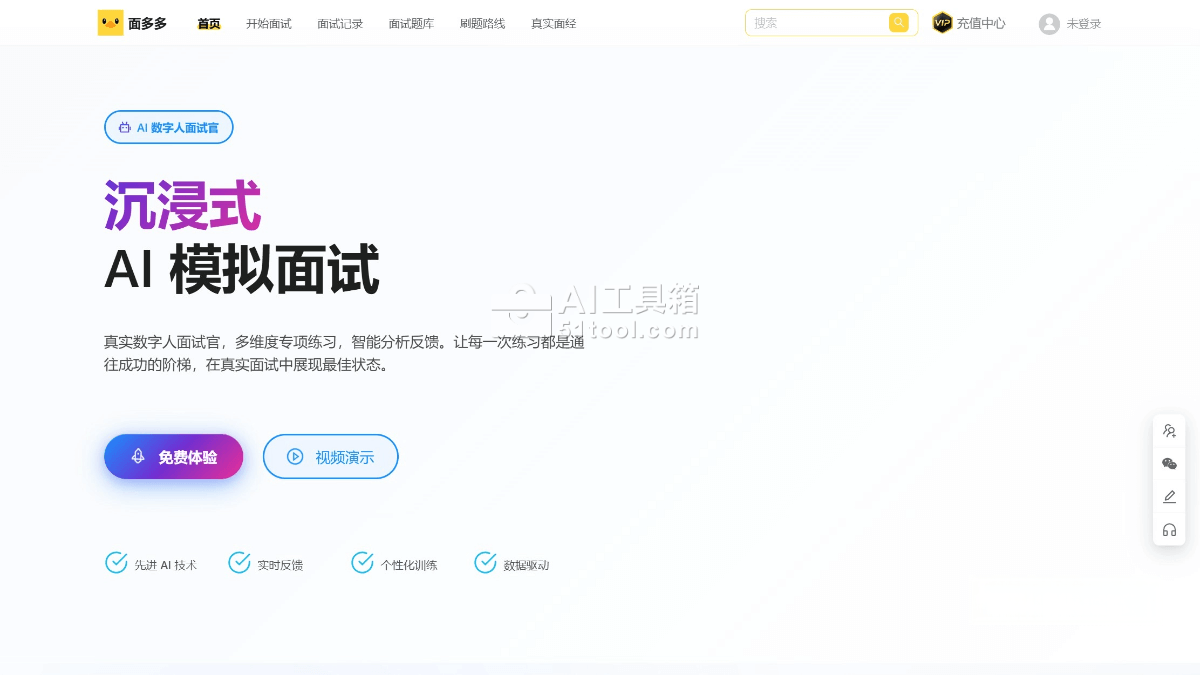 面多多是程序员鱼皮团队推出的沉浸式AI模拟面试平台,帮助求职者在面试中脱颖而出。拥有真实的数字人面试官,基于先进AI技术,能提供沉浸式的模拟面试体验,涵盖完整面试流程和真实视频对话界面。面多多提供实时智能反馈,AI会分析回答并给出专业建议和评分。能根据用户的能力和目标岗位定制个性化训练方案,涵盖技术面试、行为面试、案例分析等多维度技能提升。用户可获得1V1专业指导,基于顶级公司面试标准进行训练。面多多注重隐私安全保护,提供24*7随时练习服务。
