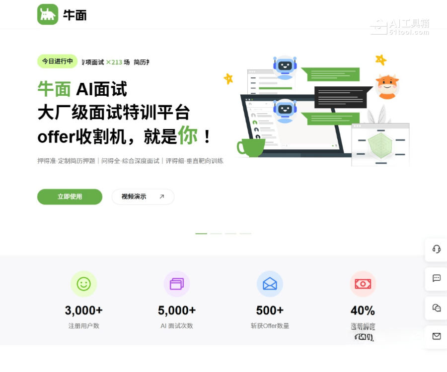 牛面AI面试是专为互联网技术人员推出的AI面试工具,通过简历押题、综合面试、专项面试和面试报告等功能,帮助求职者解决面试痛点,提升应试能力。牛面AI面试提供大厂真题,模拟真实面试场景,支持校招、社招等多种模式,支持根据用户简历生成定制化面试题。面试后生成详细报告,助力用户精准提升。