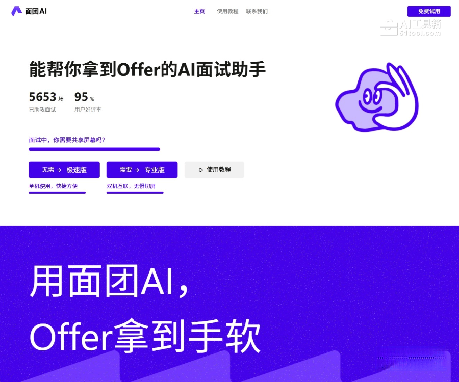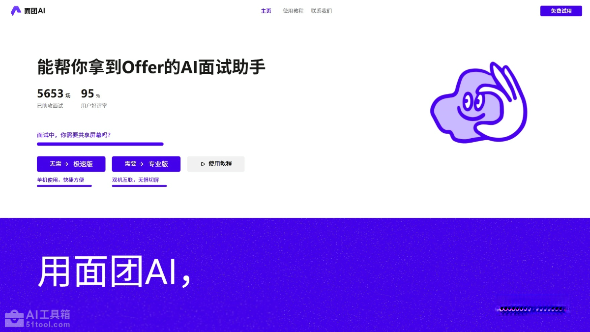 面团AI是智能面试辅导工具,专为求职者设计,能自动听懂面试官的问题,实时生成参考回答,帮助求职者更好地应对面试。面团AI支持多种设备使用,提供双端互联模式以增强隐蔽性。新用户注册能免费体验2次,主要功能包括单机使用、多语言支持、专业题库融合等。面团AI致力于提升求职者的面试表现,让面试更加轻松。