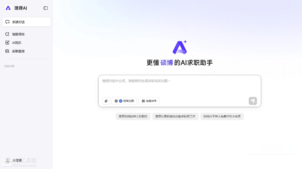- 新建对话:创建一个新的对话,你可以向理聘AI询问任何问题,当你向理聘AI表达找工作的需求时,理聘AI将会为您从理聘职位数据库和全网其他资料中选取最为匹配的职位;