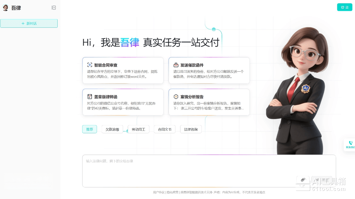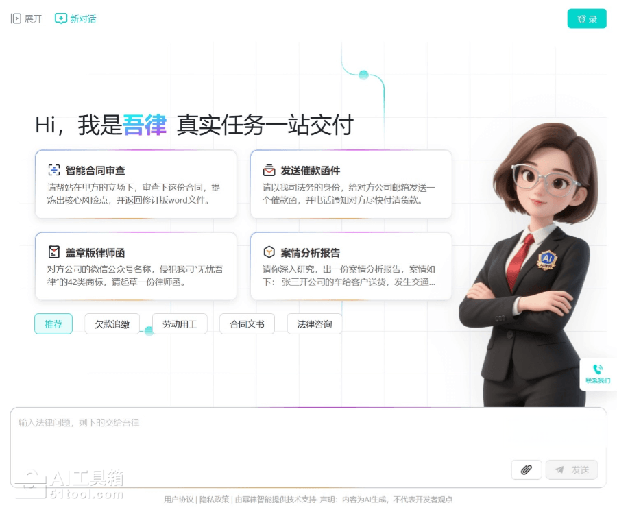 吾律AI律师是幂律智能推出的智能法律服务助手,首款能交付真实法律任务的AI律师智能体,深度参与并交付真实法律任务的智能伙伴。吾律AI律师能模拟专业律师思维,提供多轮深度对话,为用户定制化法律服务。核心功能包括智能催款、起草盖章版律师函、劳动仲裁申请书、起诉状起草及智能合同审查等。吾律AI律师能精准识别合同风险点,提供合规建议与修订方案。从法律问题的专业分析、定制化的解决方案,到具体法律任务的落地执行,吾律为用户提供全流程、一站式的法律服务,真正让专业法律服务触手可及。