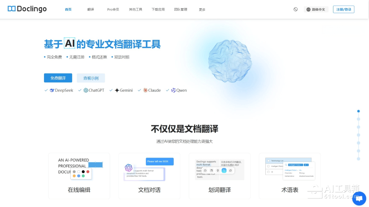 多格式文档AI翻译:支持PDF、TXT、Epub、Png、Office系列等多种文档格式的直接上传和翻译,保留原始排版,提供多AI引擎选择,精准高效处理图文内容,无需转换格式,一键完成跨语言文档处理。