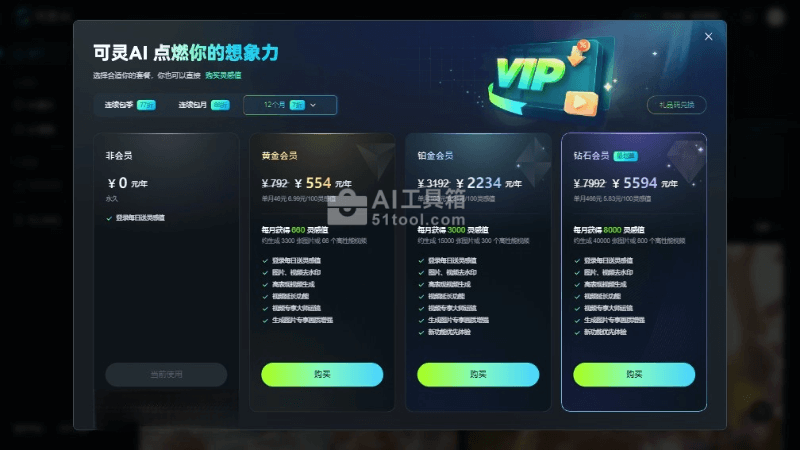 - 权益:登录每日送灵感值;每月获得8000灵感值;去水印;高表现视频生成;视频延长功能;专享大师运镜;图片画质增强;新功能优先体验。