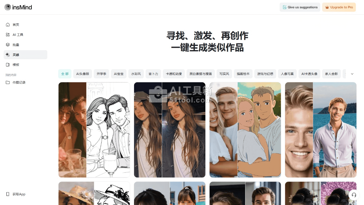 - 灵感功能:展示多样化的 AI 编辑图片示例,为用户提供创意启发和风格转换的视觉参考,一键实现图像设计。
