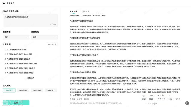 - 全文生成:一键完成文章大纲和全文的创作,让写作变得轻松快捷