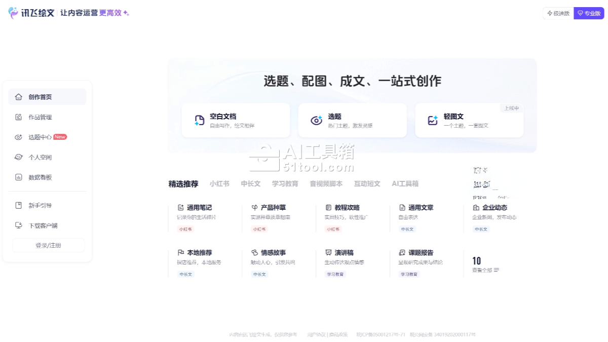 - 选择功能模块:登录后,进入操作界面,选择需要的功能模块,如选题推荐、轻图文,通用笔记,演讲稿等。