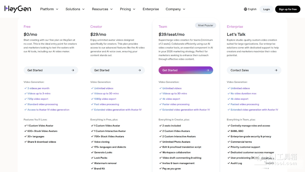 - Creator(创作者版):$29/月,无限视频生生成,最长30分钟,1080p导出,快速处理,扩展Avatar IV。