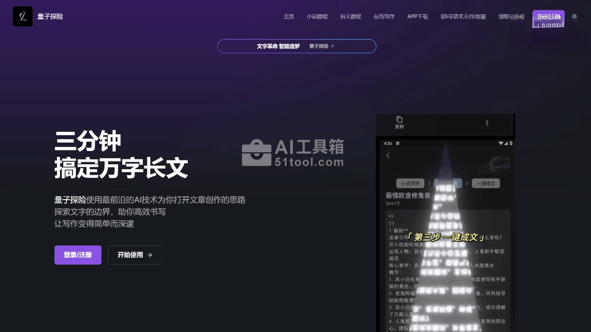 量子探险是专业的AI小说写作工具,专为提升写作效率和激发创作灵感设计。基于先进的AI技术,能快速生成高质量的文本内容,支持小说、论文、公文等多种文体的创作。用户只需输入主题或关键词,量子探险可一键生成大纲、正文,并支持续写和优化。核心优势在于高效生成、灵活定制和智能优化。支持小说创作、学术研究和日常写作等广泛场景,量子探险还具备一键降重、内容改写和导出功能,满足不同用户的需求。