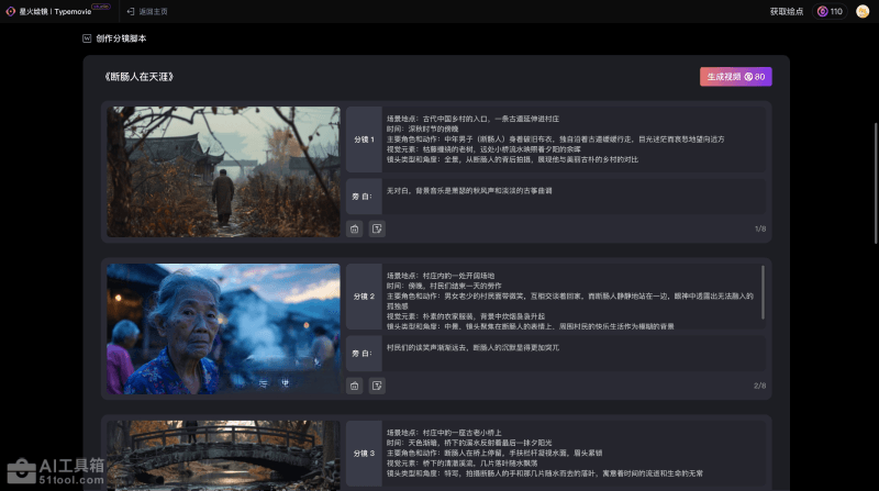 - 点击生成内容,然后生成分镜,默认会生成8个分镜