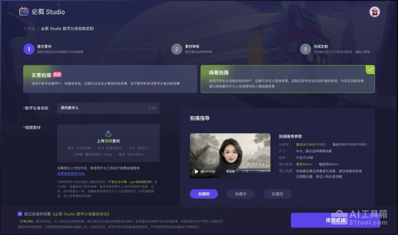 - 绿幕与实景素材支持:为了增加视频的多样性和专业性,必剪Studio支持用户上传绿幕或实景视频素材,与数字分身结合使用,以实现更加丰富和逼真的视频效果。