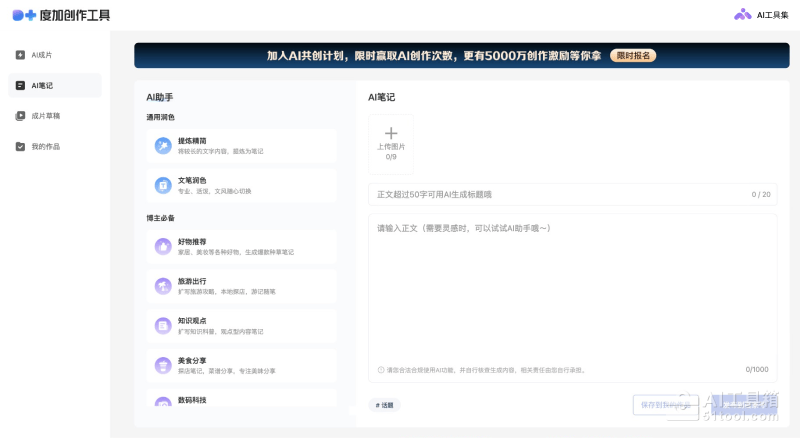 - AI笔记。创作者输入文本,AI 可以对已有文案进行润色、提炼与改写;创作者输入关键词,AI 可以根据关键词为用户制作文案,包括标题和正文,满足日常分享、营销推广、博主种草、知识输出等各类创作需求。