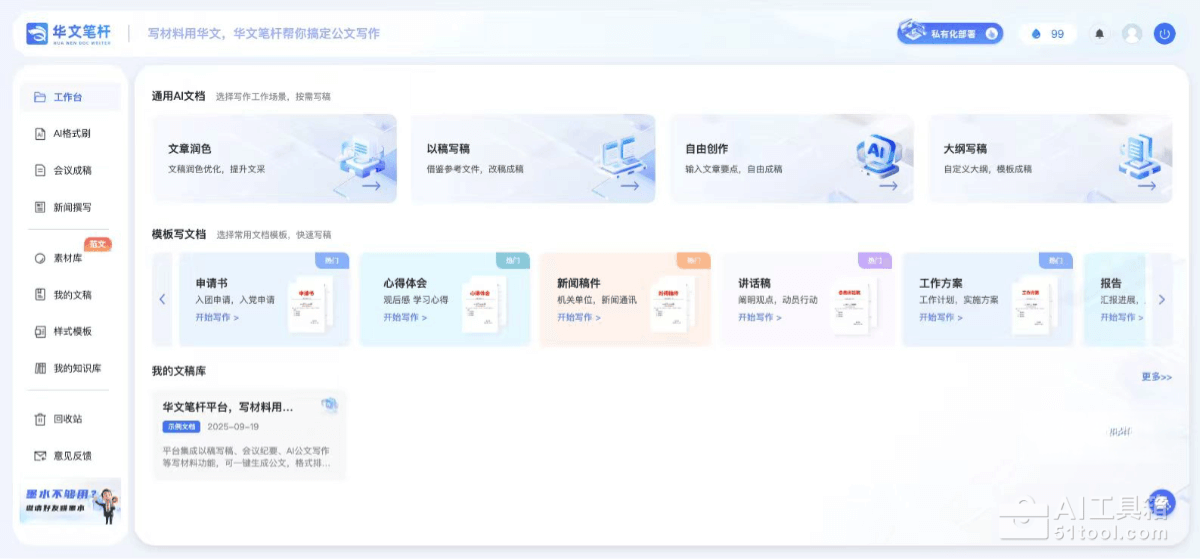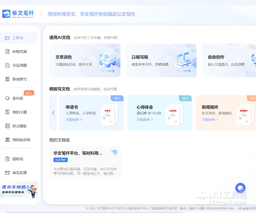 • 全流程公文写作支持:基于最新公文规范,结合 AI 技术,提供从起草到定稿的全流程支持,包括自动生成标准格式、智能推荐内容模板。