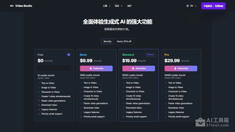 - 免费计划:每月提供 10 积分,相当于可以生成 1 个视频。功能包括文本到视频、图像到视频、角色到视频。同时只能创建 1 个视频。