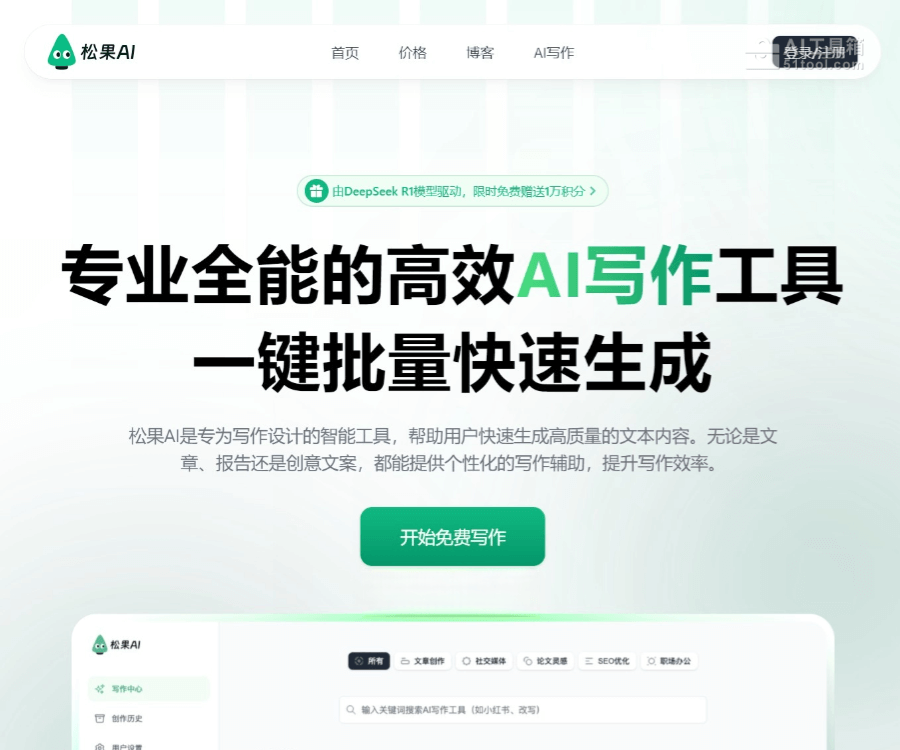 松果AI写作是专业的AI写作工具,基于大模型技术,支持批量文章生成,专为提升写作效率而设计。AI写作工具支持文章、报告、创意文案等多种文本类型的创作,提供改写、扩写、续写、润色等个性化功能。