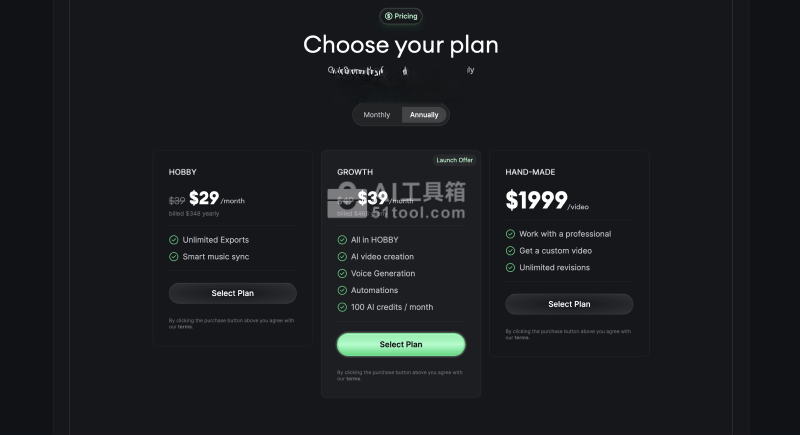 - Growth版:49美元每月(年付版468美元,约39美元每月),所有Hobby版的功能加上AI视频生成、语音生成、自动化视频编辑、每月100个AI积分